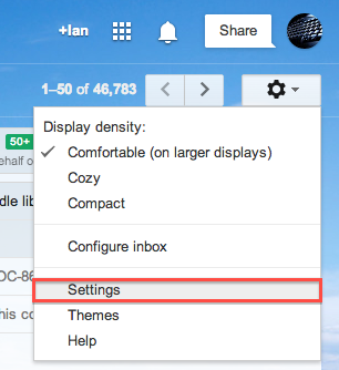 2. Click on the gear icon in the upper right corner of your browser, right under your name and icon, and click on SETTINGS